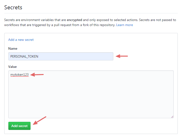 After clicking "Add a new secret" add a name of the secret "PERSONAL_TOKEN" and in value field, add your token.